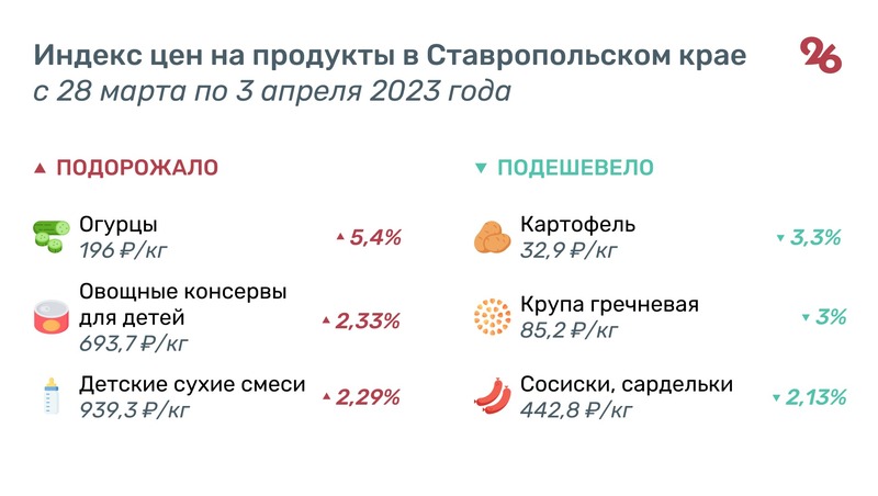 С 28 марта по 3 апреля в Ставропольском крае на 5,4% выросли в цене огурцы и на 3,3% подешевела картошка.