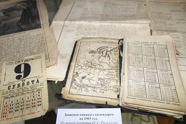 В экспозицию включены уникальные издания из отдела редкой книги Лермонтовки: Никольский В. К. «Происхождение нашего летоисчисления», «Всеобщий календарь» (1868), «Современный календарь на 1896 г. А. Д. Ступина».