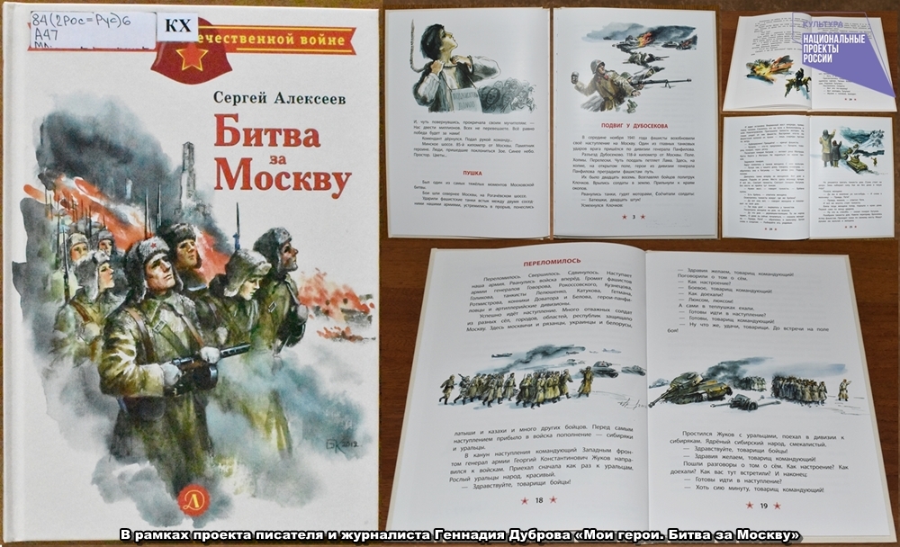 В книге известного детского писателя Сергея Петровича Алексеева «Битва за Москву» рассказывается о ярких эпизодах Московской битвы, начиная с первых дней и до декабрьского контрнаступления советских войск,