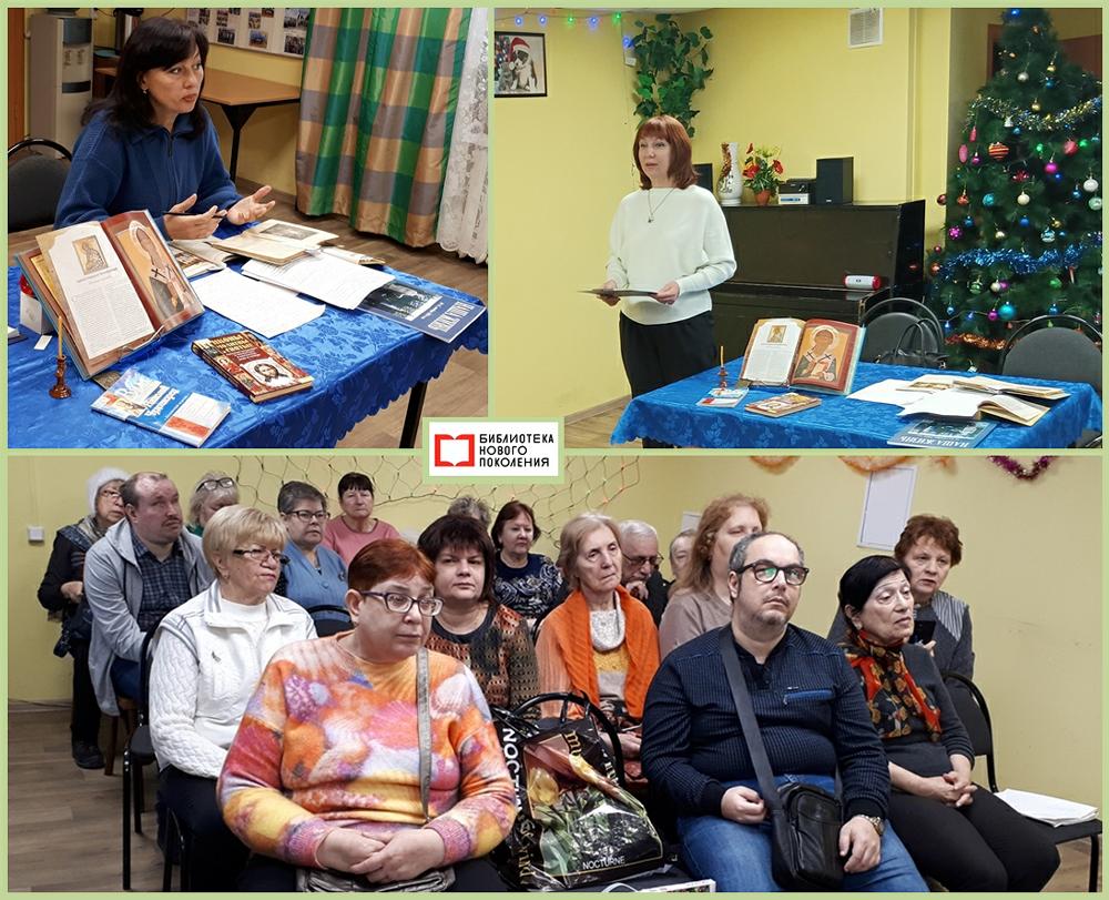 А ведущий библиотекарь отдела обслуживания Ольга Ревина познакомила слушателей с малоизвестными фактами из жизни святителей Николая Чудотворца Мирликийского и Спиридона Тримифунтского, у которых в декабре отмечаются памятные даты. Ведущая прочитала вслух фрагменты из жития святых чудотворцев. Специально к встрече была оформлена книжная выставка «Любимые святые» из фонда общего читального зала библиотеки.