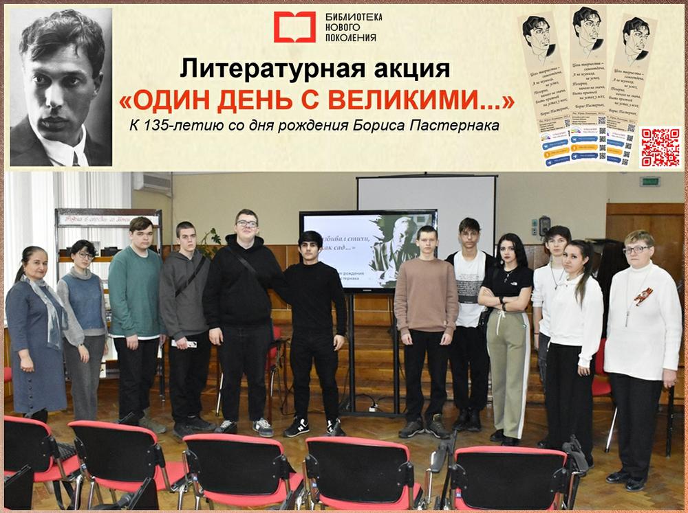В рамках проекта «Один день с великими» сотрудники отдела обслуживания Центральной городской библиотеки им. М. Горького Светлана Круско и Александра Рященко провели литературно-музыкальную композицию «Я разбивал стихи, как сад», посвящённую 135-летию со дня рождения Бориса Пастернака.