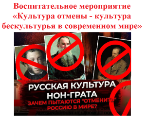 3 марта 2023 г. в рамках реализации воспитательной работы гражданско-патриотической, духовно-нравственной и культурной направленности заведующим кафедрой экспериментальной лингвистики и межкультурной компетенции Института иностранных языков и международного туризма ПГУ, доц. Елькиным В.В. было проведено мероприятие на тему «Культура отмены — культура бескультурья в современном мире» со студентами 4 курса ИИЯМТ, обучающимися по направлению подготовки 45.03.02 – Лингвистика (направленность (профиль): теория и практика межкультурной коммуникации).