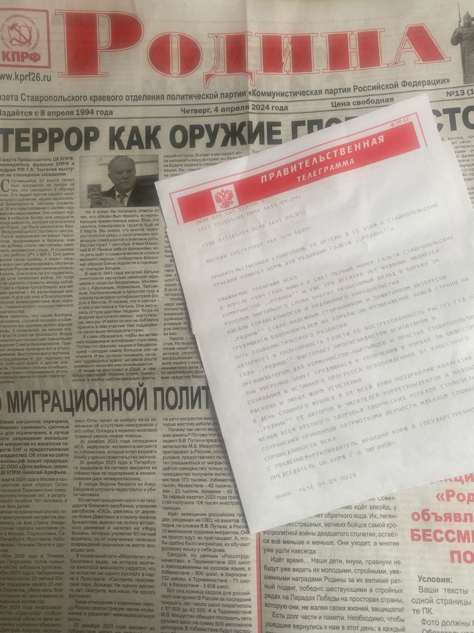 Уважаемые товарищи! В апреле 1994 года вышел в свет первый номер газеты ставропольских коммунистов «Родина», и уже три десятка лет издание является рупором партийного слова,