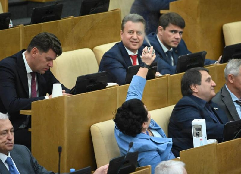 В этот же день в Telegram-каналах появились кадры с Раисой Кармазиной — депутатом Госдумы от Ставрополья, которая пришла на осеннюю сессию не с пустыми руками. Народная избранница, вооружившись диспенсером и аэрозолью-антивирусом, обеззаразила сидящих рядом коллег. Некоторым пришлось пшикнуть чуть ли не в лицо.