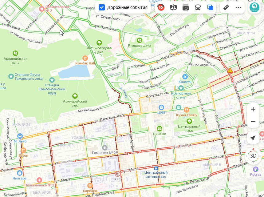 Из-за такой обстановки еще до вечернего часа-пик в южной, северо-западной и центральной части краевой столицы образовались 10-балльные пробки.
