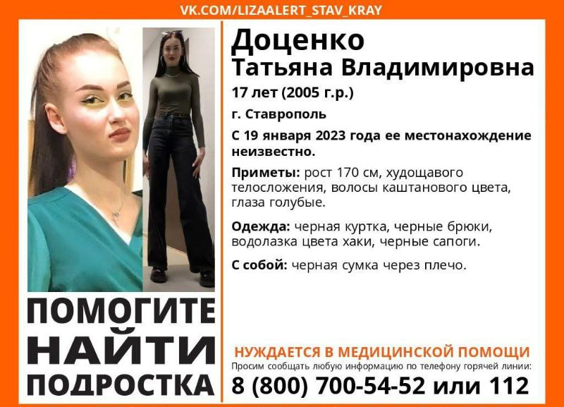 В Ставрополе пропала 17-летняя девушка. Жительница краевой столицы ушла из дома два дня назад и больше о ней ничего неизвестно. Ориентировку на ее поиски разместил поисково-спасательный отряд «ЛизаАлерт».Татьяне Доценко 17 лет, живет в Ставрополе. С 19 января 2023 года ее местонахождение неизвестно.