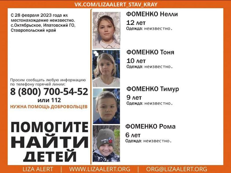 Во вторник, 28 февраля, Ставрополье встревожила новость о пропаже детей в селе Октябрьском Ипатовского округа. 12-летняя, 10-летняя девочки и 9-летний и 6-летний мальчики исчезли без следа, передает поисково-спасательный отряд «ЛизаАлерт».