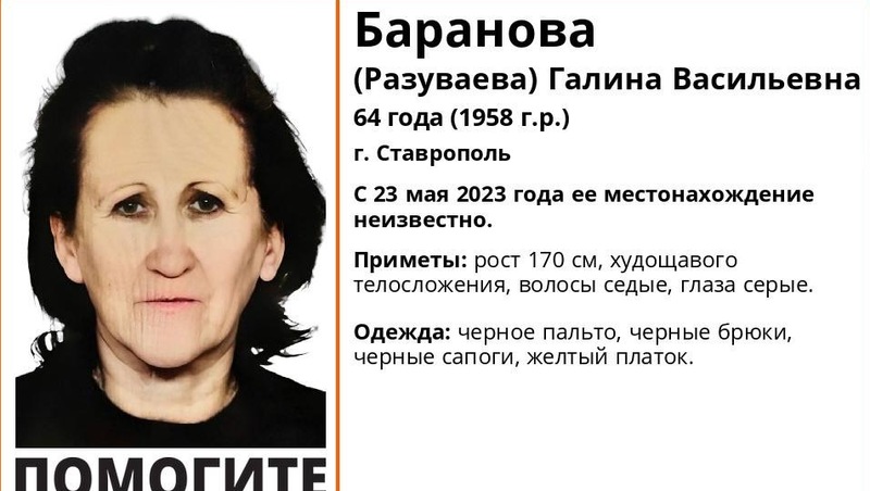 В столице Ставропольского края разыскивают женщину 64 лет. Как сообщили в региональном поисково-спасательном отряде «ЛизаАлерт», с 23 мая местонахождение Галины Барановой (Разуваевой) неизвестно.