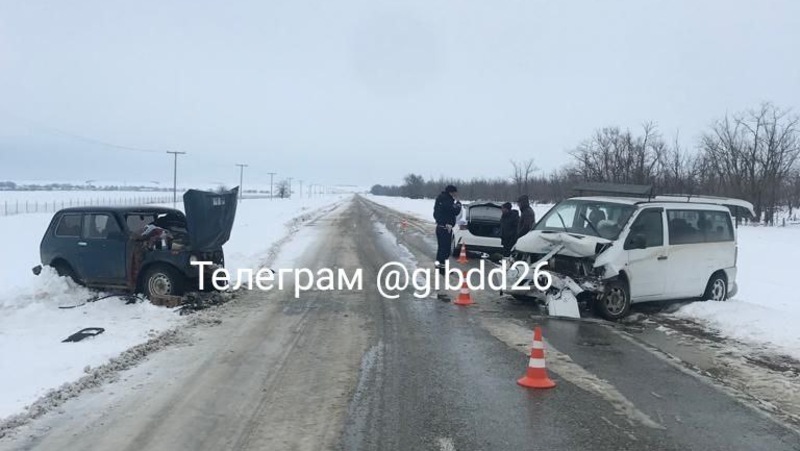 ДТП произошло 18 февраля около 13:00 на 81 км трассы «Журавское — Благодарный — Кучерла — Красный Маныч». По предварительным данным водитель Mercedes-Benz Vito выбрал небезопасную скорость на зимней дороге, выехал на встречную полосу и врезался в Ладу Ниву.