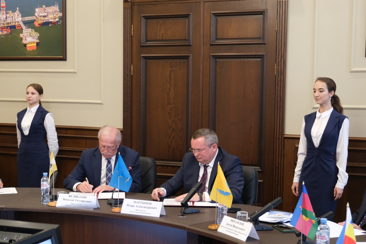 Заключено соглашение о межпарламентском сотрудничестве Думы Ставропольского края с Думой Астраханской области. Подписи под документом поставили председатели региональных законодательных органов Николай Великдань и Игорь Мартынов. Церемония подписания прошла в Астрахани в рамках XXXIX конференции Южно-Российской Парламентской Ассоциации (ЮРПА).