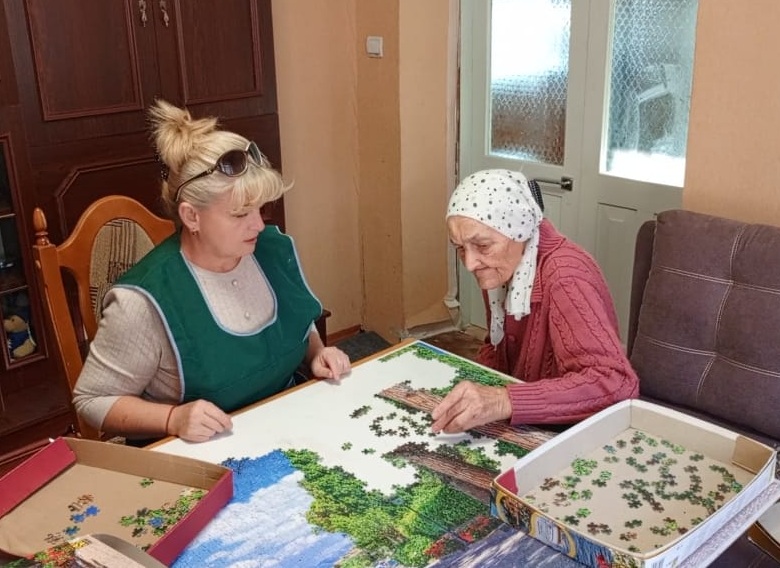 Социальные работники отделения, исходя из индивидуальных особенностей и потребностей, проводят с получателями социальных услуг различные упражнения, способствующие поддержанию памяти, внимания, моторики: пальчиковую гимнастику, решение головоломок, ребусов, кроссвордов. Они вспоминают с ними стихи, песни, пословицы. Привлекают к занятиям вышивкой, вязанием. Собирают с ними картины из пазлов.