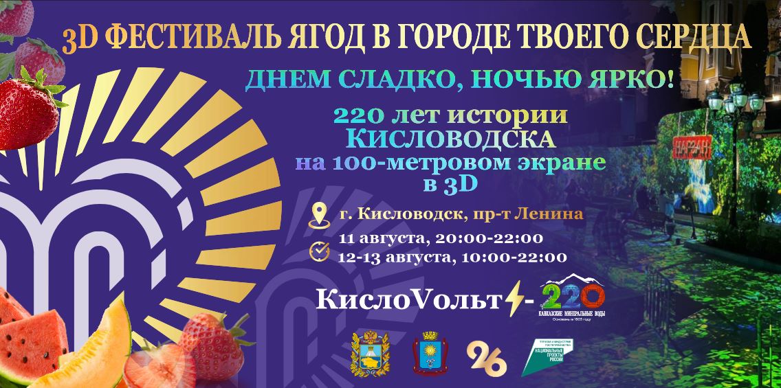 «Такого вы ещё не видели! 3 дня ягодной феерии днём и световое 3D-мэппинг шоу ночью - история города на 100-метровом каменном экране! Днём сладко, ночью ярко! Не пропусти наш грандиозный фестиваль «КислоVольт-220», посвящённый 220-летию истории Кисловодска, на проспекте Ленина с 11 по 13 августа. Всех гостей ждет дневная гастрономическая и концертная часть фестиваля, а с 20.00 погрузимся в виртуальную историю города на каменном экране на стене и по пешеходной зоне проспекта длиной более 100 метров. Ждём всех в Кисловодске», - рассказал глава Кисловодска Евгений Моисеев.