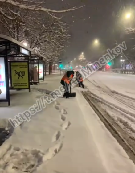 Несмотря на прекращение снегопада, работы не останавливаются, техника сгребает навалы снега с проезжей части автомобильных дорог, также лопатами чистятся тротуары и остановочные пункты.