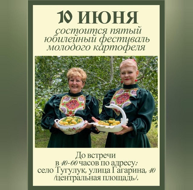 В эту субботу, 10 июня 2023 года, в 10-00 часов, по адресу: село Тугулук, улица Гагарина, 10, состоится V праздник-фестиваль молодого картофеля.