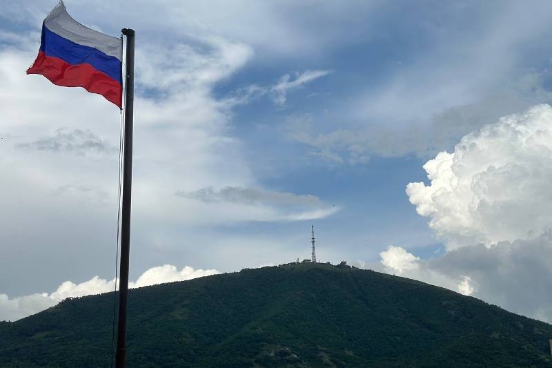 70-метровое полотно флага развернули на улице имени генерал-лейтенанта Козлова, Героя Советского Союза - в самом центре Пятигорска.