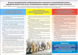 В целях своевременного информирования населения о возникновении угрозы террористического акта могут устанавливаться уровни террористической опасности.