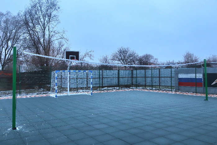 На месте пустыря появилось поле для мини футбола с мягким покрытием, волейбольные и баскетбольные стойки с кольцами, спортивные тренажеры, навес, скамьи, урны, ограждение и брусчатка.