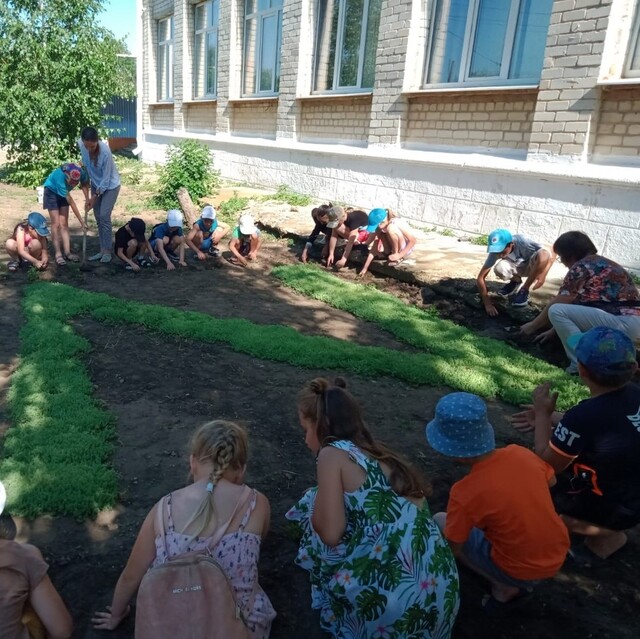Воспитатели летнего пришкольного лагеря вместе с детьми креативно подошли к озеленению клумбы высадив декоративную композицию в поддержку российских военнослужащих.