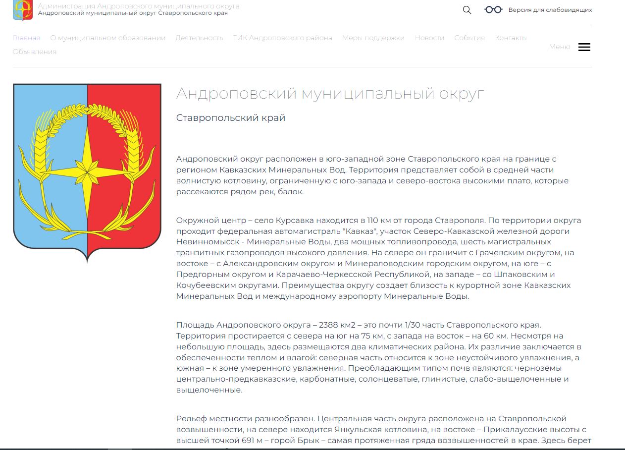 Уважаемые друзья, с 1 августа 2023 года информация о деятельности администрации Андроповского муниципального округа Ставропольского края размещается на https://kursavka-r07.gosweb.gosuslugi.ru/