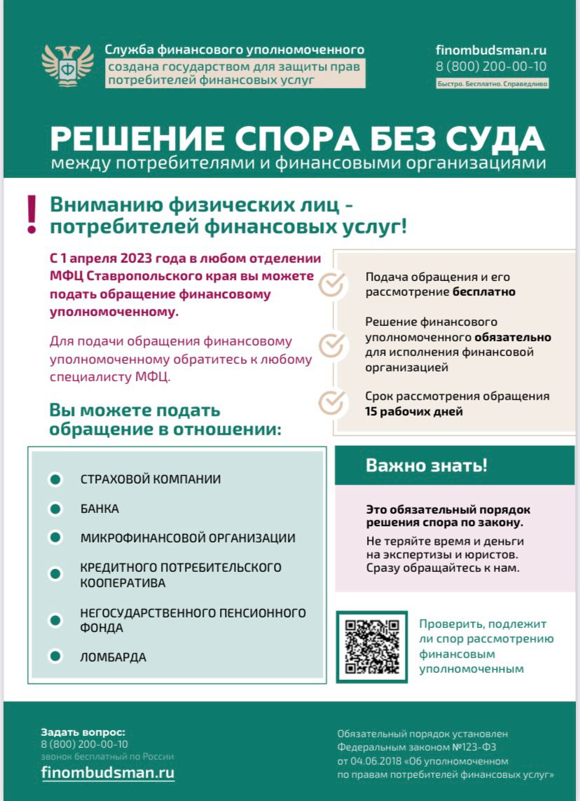 С 1 апреля 2023 года в любом отделении МФЦ Ставропольского края вы можете подать обращение финансовому уполномоченному.