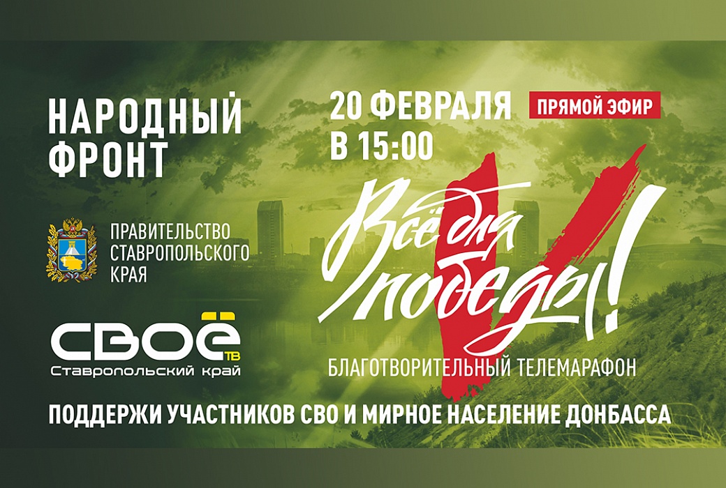 В следующий понедельник, 20 февраля, в эфире ставропольского телеканала «СвоёТВ», а также на сайте и в социальных сетях телеканала, пройдёт трансляция благотворительного телемарафона «Всё для Победы» с участием губернатора Ставрополья Владимира Владимирова. Начало вещания в 15:00. Эфир посвятят помощи бойцам СВО из региона.