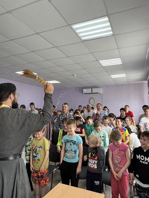 В преддверии Дня защиты детей и в завершении учебного года священник провел духовную беседу с детьми и коллективом школы-интерната, отслужил молебен и подарил к празднику детям подарки: книги, игры и игрушки.