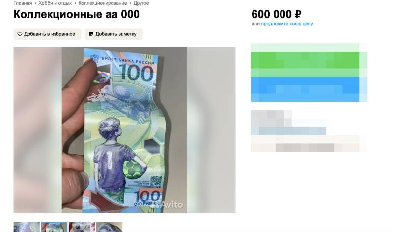 «Купюра 100 рублей, вышедшая к чемпионату мира по футболу ФИФА 2018 — стала третьей памятной банкнотой в современной России. На переднем плане лицевой стороны изображен держащий мяч ребенок. На втором плане мы видим легендарного советского вратаря Льва Яшина, который запечатлен в попытке поймать мяч. Банкнота защищена множеством специальных элементов. Под УФ-лучами становятся видны логотип и эмблема ЧМ по футболу 2018» , — обозначил плюсы продавец.