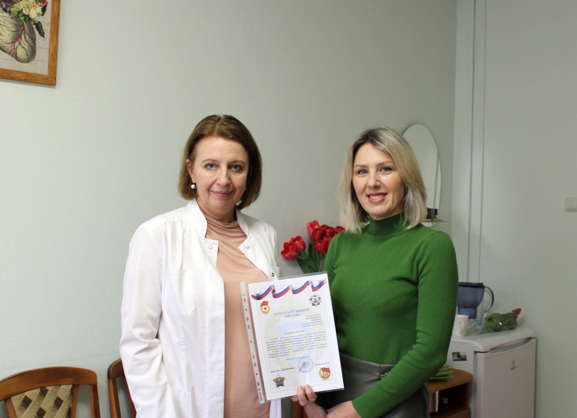 Сегодня, 7 марта, координатор движения «Народный фронт» Анна Шейкина вручила заместителю главного врача Елене Николаевна Даниловой адресованное нашему коллективу благодарственное письмо от имени воинов- десантников,