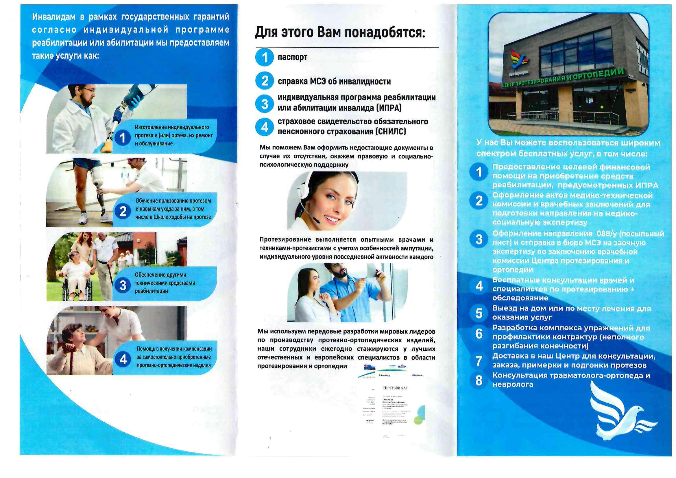 Медицинскую документацию о течении основного заболевания (желательно иметь) Паспорт СНИЛС Справку об инвалидности Индивидуальную программу реабилитации (ИПРа/ПрПП)В случае отсутствия у инвалидов-ампутантов необходимых документов, сотрудниками Центра будет инициировано получение недостающих документов собственными силами или путем правового сопровождения пациента.Для получения консультации необходимо обратиться по адресу: г. Ставрополь, ул. Серова, д. 388А