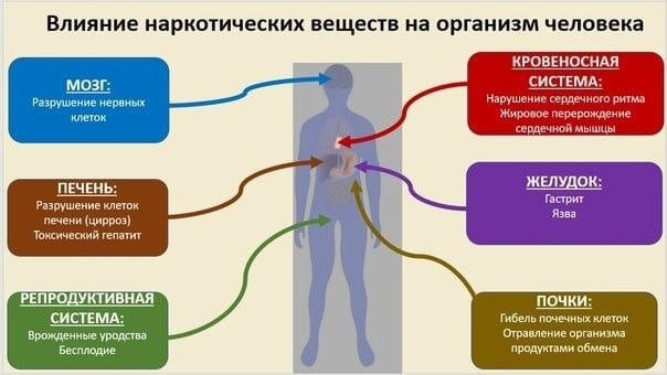 Употребление наркотиков вызывает изменения психики, замкнутость, обеднение эмоциональных реакций, расстройства восприятия, двигательные нарушения. Поскольку все яды в организме обезвреживаются печенью, прием наркотиков вызывает гибель ее клеток и развитие цирроза. А из-за постоянной стимуляции систем организма у наркоманов быстро истощается сердечная мышца, и значительно снижается иммунитет. Кроме того, из-за пользования общими шприцами и частого отсутствия половой гигиены наркоманы нередко заражают друг друга гепатитом В и С, сифилисом и ВИЧ-инфекцией.