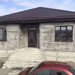 Дом в одном уровне на высоком фундаменте без подвала. По периметру залит фундамент под забор. В доме 4 спальни по 17-18кв.м. и кухня-гостиная 38кв.м. Два санузла и кладовка-котельная. Окна berta, теплые полы, гипсокартонный потолок. Ремонт. Можно заходить и жить. Есть мебель и бытовая техника.